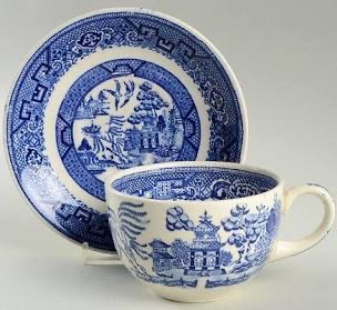 On the place mat set a blue and white weeping willow patterned china demitasse cup, saucer